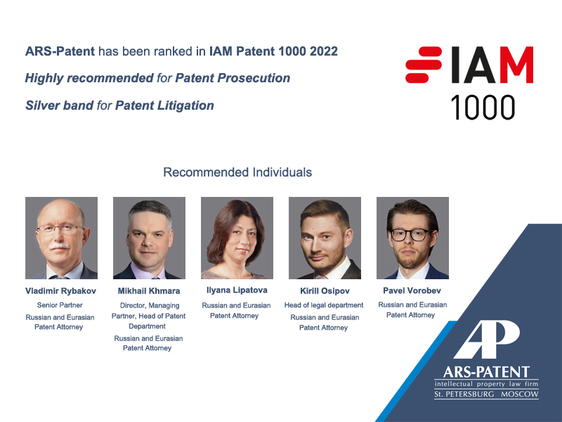 ARS-Patent Highly Recommended by IAM Patent 1000 July 13, 2022 We are delighted to be recognized by the 2022 edition of IAM Patent 1000: The World’s Leading Patent Professionals, which identifies the top patent professionals in key jurisdictions around the globe. ARS-Patent has been awarded the rating “Highly Recommended” in the category Prosecution and Silver band in the category Litigation and transactions. The recommended patent practitioners according to IAM Patent 1000 2022 are Vladimir Rybakov, Mikhail Khmara, Ilyana Lipatova, Kirill Osipov and Pavel Vorobev. For the full ranking results, please follow the link. Make an enquiry