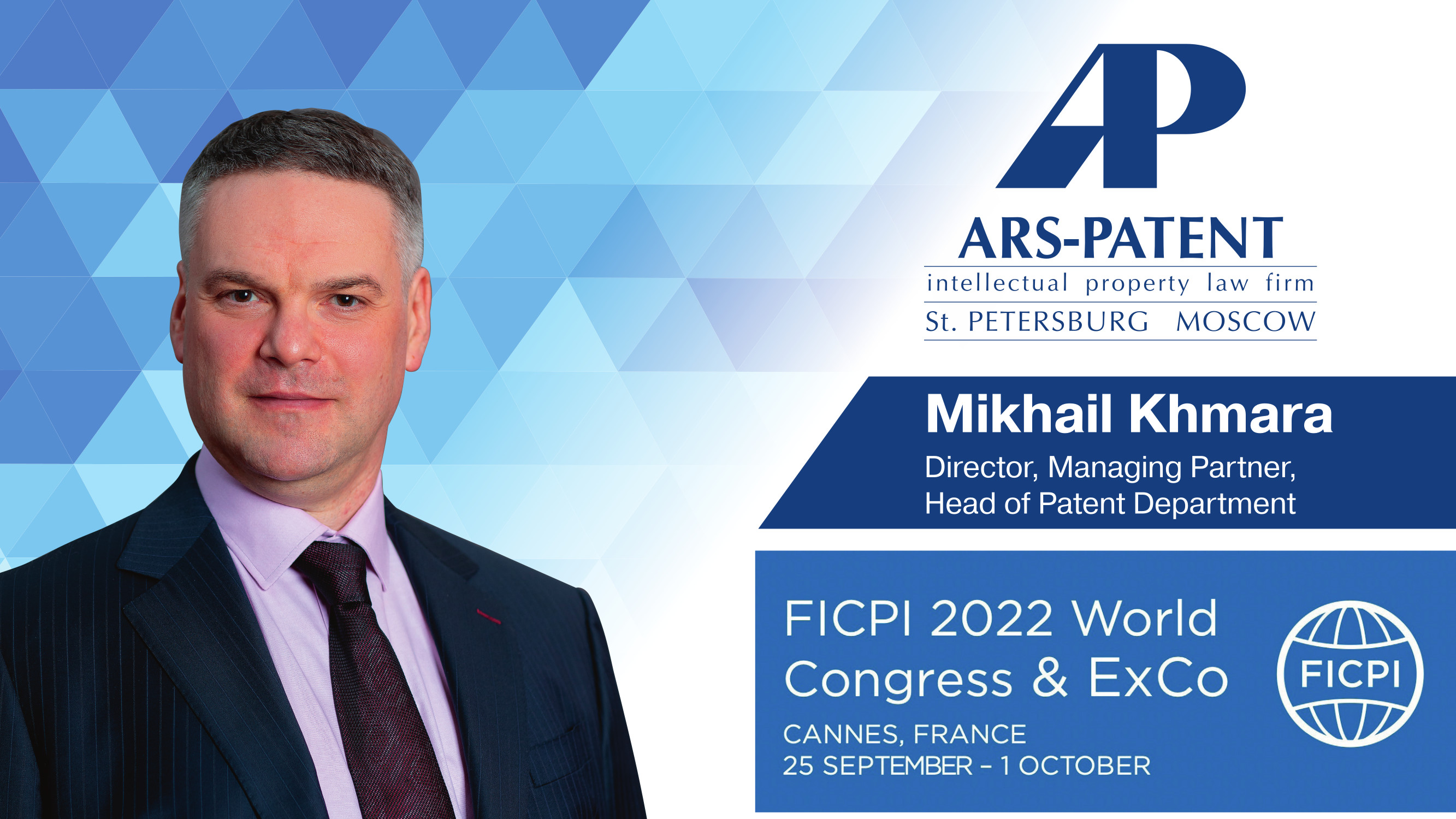 Mikhail Khmara will participate in the FICPI World Congress 2022 September 14, 2022 Mikhail Khmara, Director, Managing Partner and Head of Patent Department of ARS-Patent will take part in the FICPI World Congress 2022 in Cannes, September 25-29, the first meeting of the FICPI global community of independent IP attorneys in three years. The participants of FICPI World Congress will have the opportunity to listen to and debate with the experts on recent international developments in intellectual property protection and their impact on day-to-day practice. Please read more about the event here. To arrange a meeting with Mr. Mikhail Khmara, please contact us via office@ars-patent.co.uk. Make an enquiry